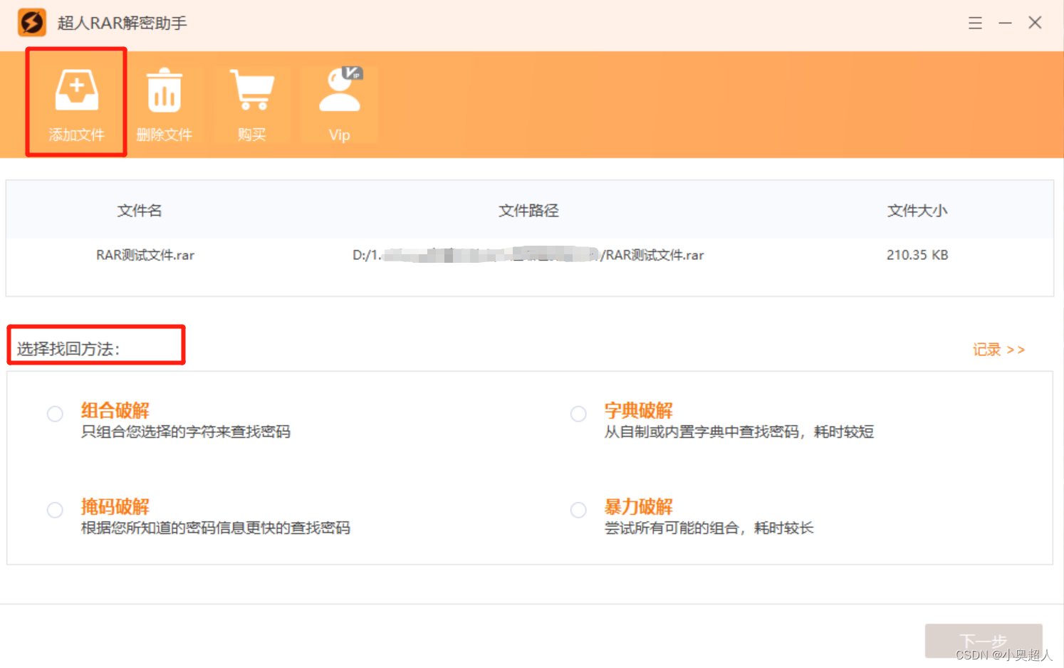 还有就是使用工具来帮助我们找回密码,比如超人RAR解密助手, 提供了四种解密方式帮助我们找回密码,但是同样也没办法找会带有中文的密码。