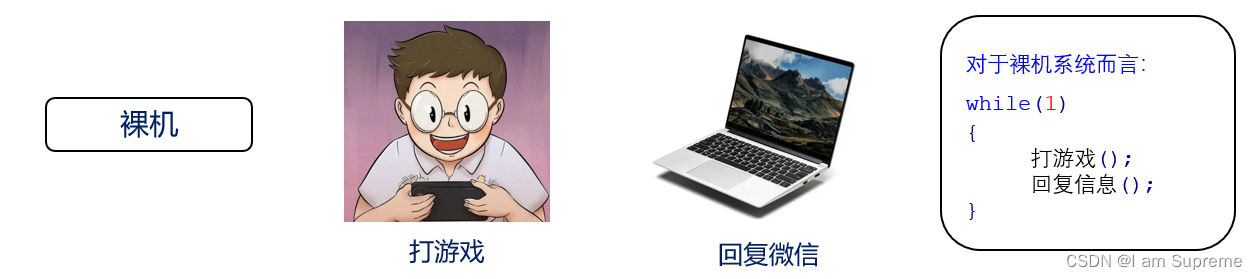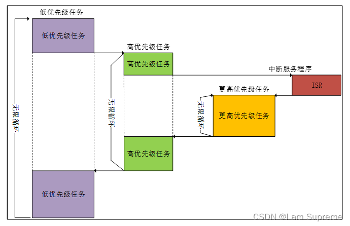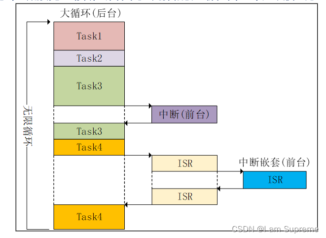 裸机:裸机又称为前后台系统,前台系统指的中断服务函数,后台系统指的大循环,即应用程序