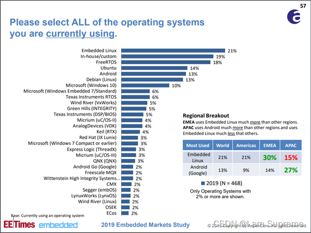 下图为2019年 RTOS使用排名,可以看出学习freertos还是非常有必要的。