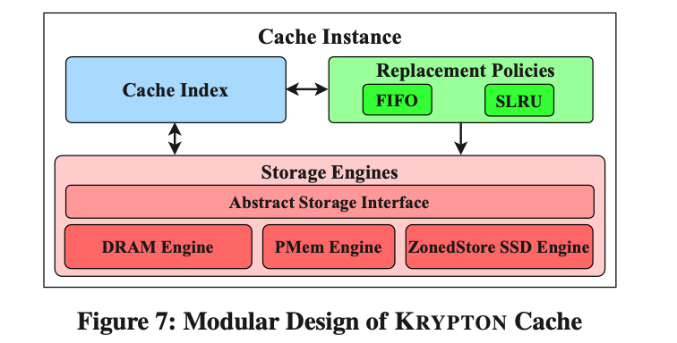 为了满足性能的需求,Krypton 在 Data Server 内部实现了一个多级 Cache,可以使用 DRAM、PMEM 和 SSD 来作为 Cache 的存储介质。如下图所示,Cache 模块包含了三个部分:Cache Index、Replacement Policy 和 Cache Storage Engine。