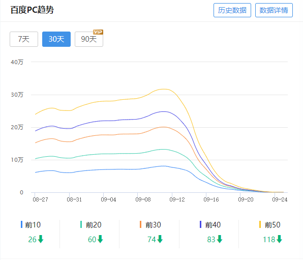 如果你的百度资源平台,点进去出现这个提示,说明您的网站已经被百度清退了。如果你的网站被清退了,网站可能会出现关键词,收录,排名,流量,悬崖式的下跌。(这个数据我是观察别人的一个网站得出的(参考下图最近30天的关键词排名情况)具体是哪个网站,这里就不给出了),这次清退受到影响的站长不计其数。