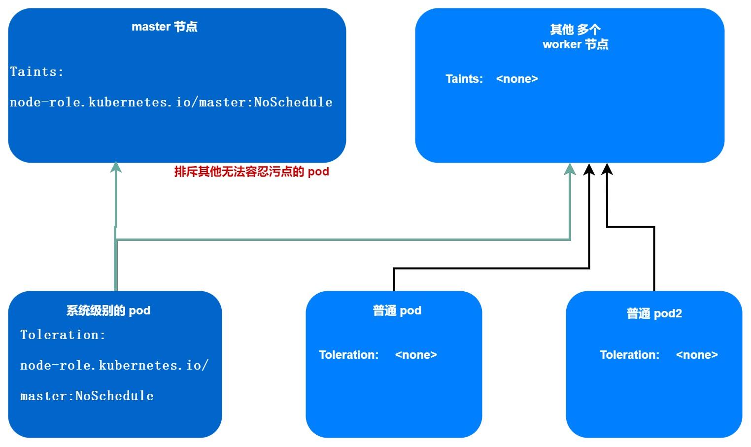 一般情况下,用于系统的 pod 会容忍 master 上的这个污点也,就是说这样的 pod 就可以部署到master上