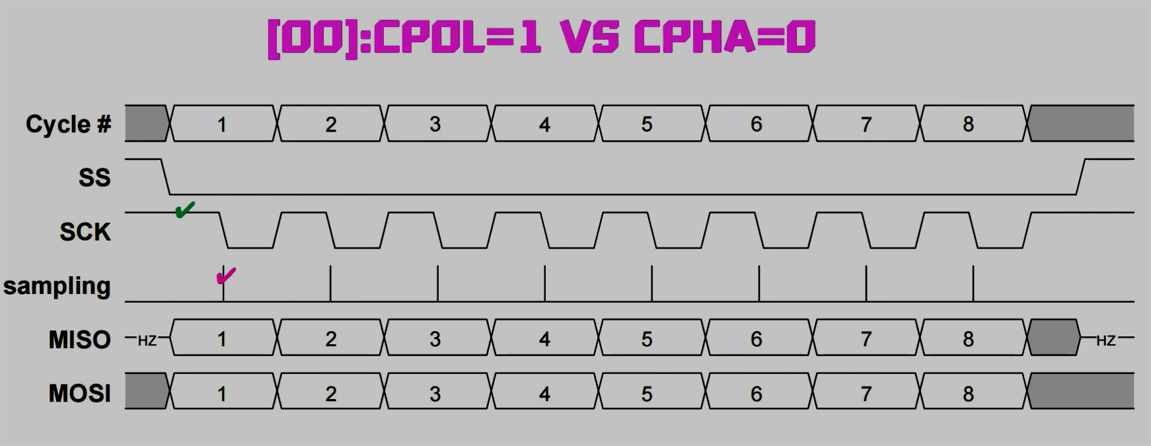 此时SCK为低电平时表示空闲状态,并且在SCK产生第一个跳边沿时开始数据的采集,也就是上图紫色对号的位置,SCK第一个上升沿产生的位置开始采集数据。