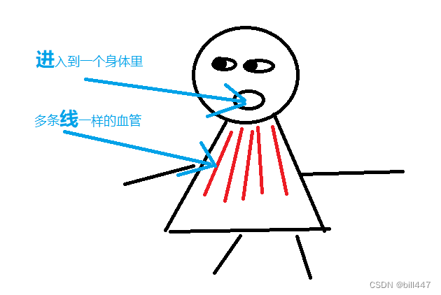 进入到身体后,转换为一管管像“线”一样的血管中,血管就是多个“线程”