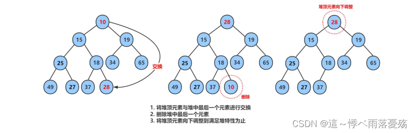 删除堆是删除堆顶的元素,将堆顶的元素根据最后一个数据一换,然后删除数组中最后一个元素,再进行向下调整算法。