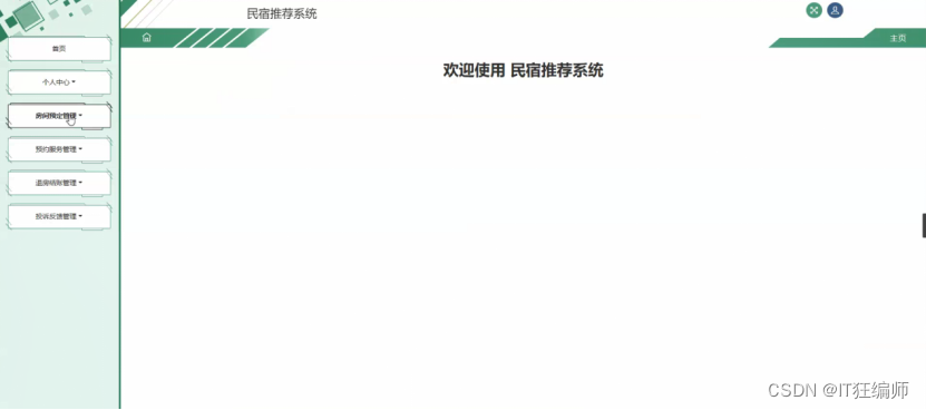 用户进入系统可以对个人中心、房间预定管理、预约服务管理、退房结账管理、投诉反馈管理等功能进行操作。