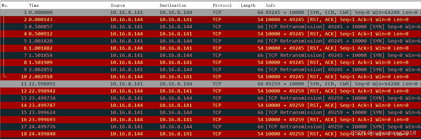 可以看到进行三次握手时,TCP客户端向该TCP服务器的10000端口发送了SYN报文,但是TCP服务器返回了RST报文。此时我们用netstat命令查看到10000端口没有被监听了,这意味着该端口被关闭或者不在监听中了。
