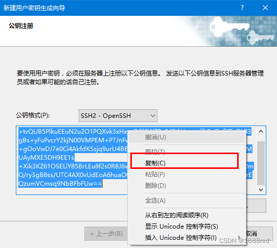 单击“下一步”按钮,打开如下图所示公钥注册窗口,全选公钥信息,右键复制。