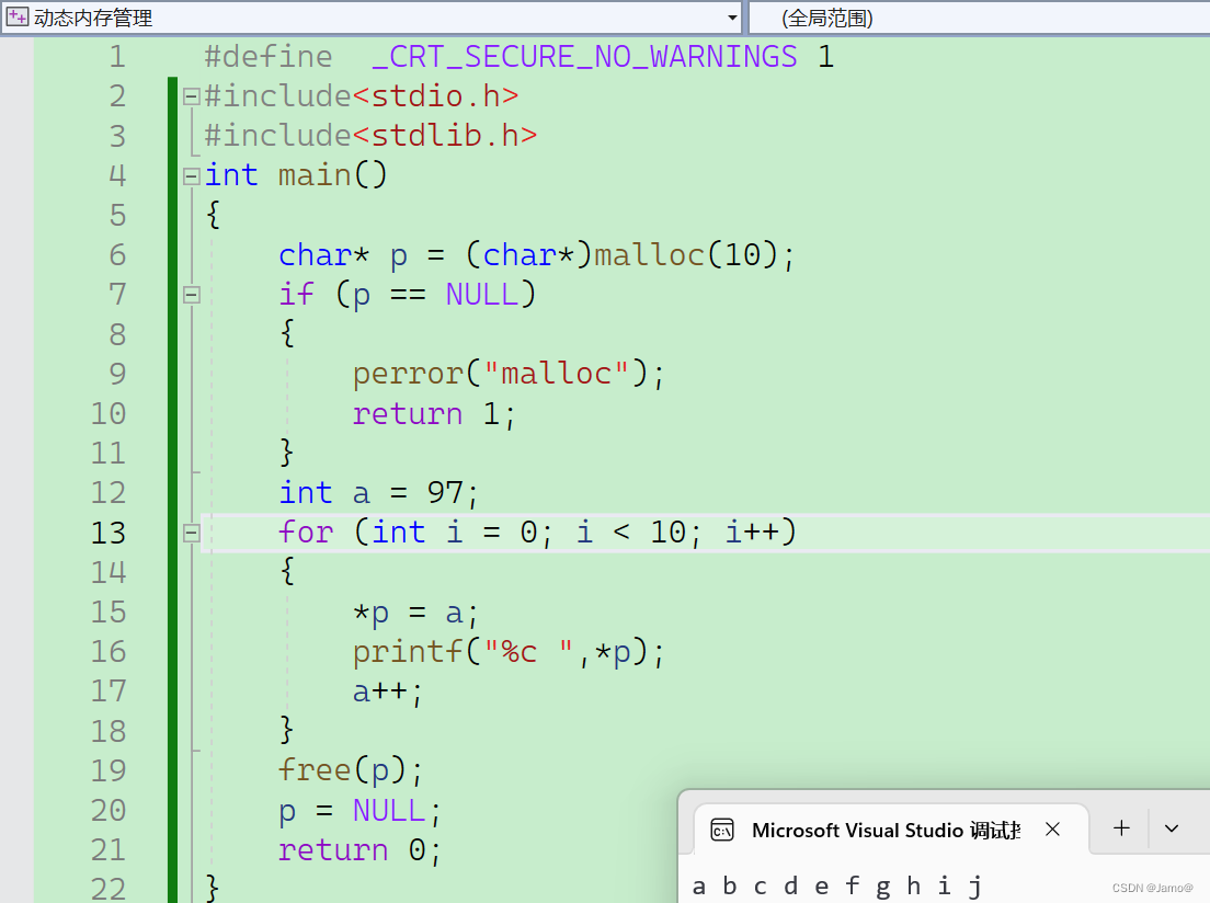 可以看到标题写的malloc和free函数是搭配在一起来使用的,我们既然向内存借用申请了空间,那么在结束的是时候一定要free释放掉我们借来的“东西”。