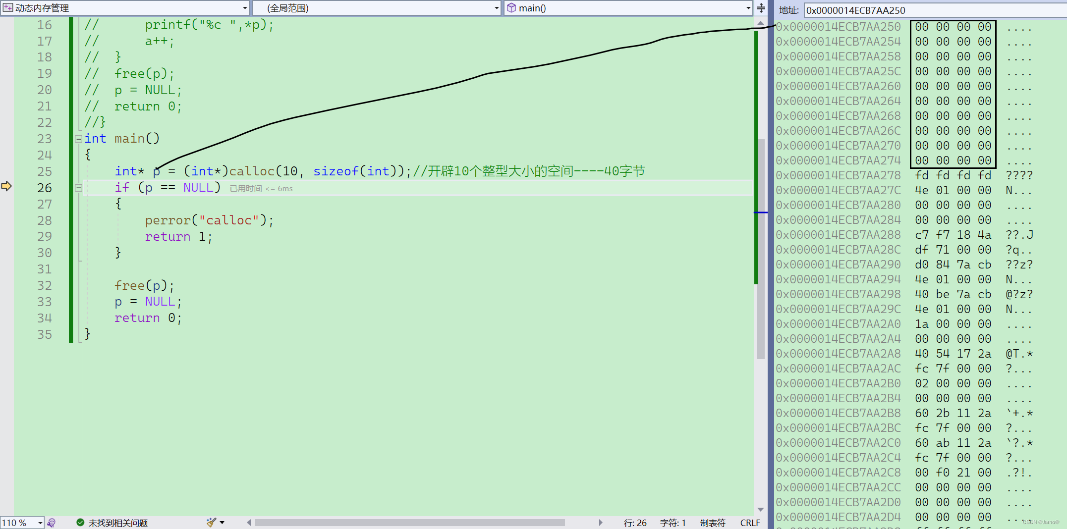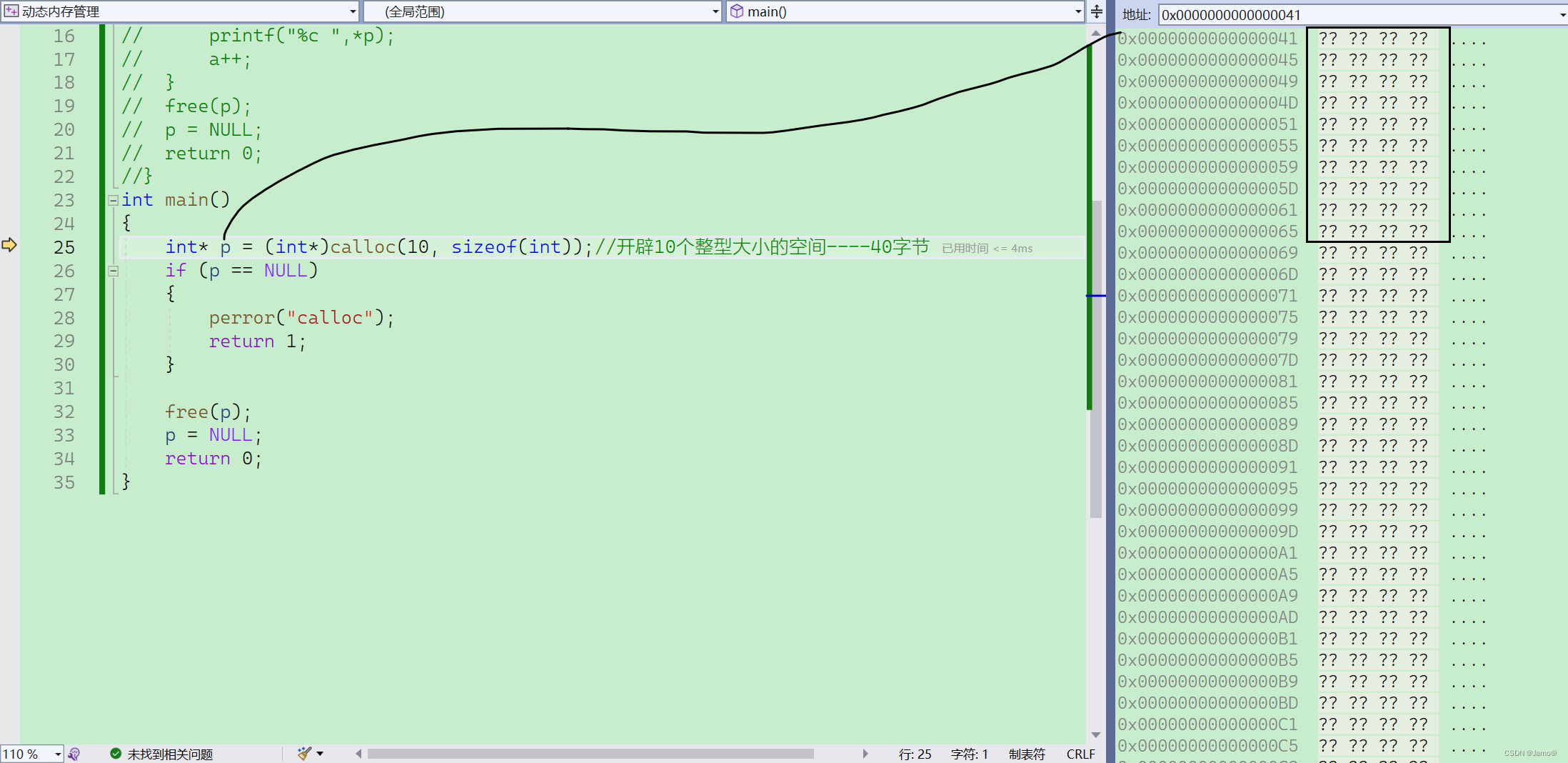 - int* p = (int*)calloc(10, sizeof(int));//开辟10个整型大小的空间----40字节