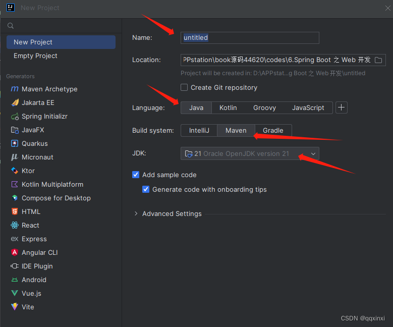 输入项目名 hello 选择java maven 和本机已经装好的java环境JDK,然后选择Create 创建