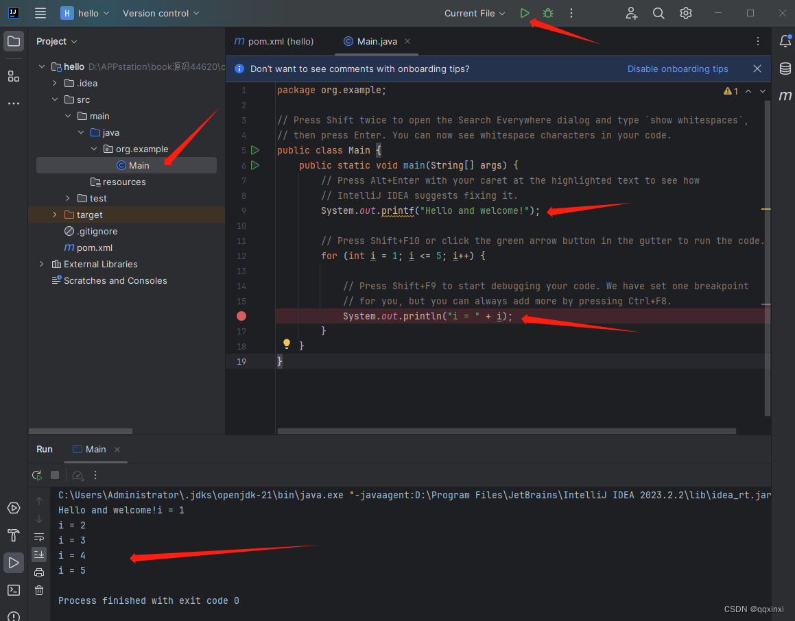 4.创建好的文件,带有样例代码。点击绿色的空心箭头,运行