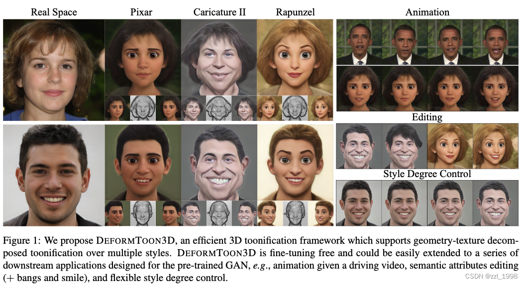 。 - 在考虑3D人脸卡通化时,现有方法将G视作一个整体进行fine-tune。DeformToon3D用StyleField作为几何风格化,fine-tune体渲染器实现纹理风格化。