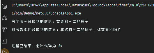 - Console.WriteLine("租房者" + name + "获取到的信息:" + message);