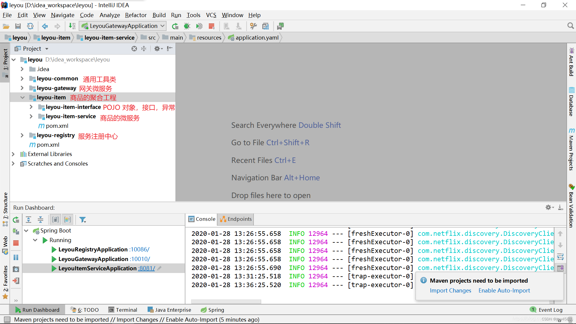 我们分别启动:leyou-registry,leyou-gateway,leyou-item-service