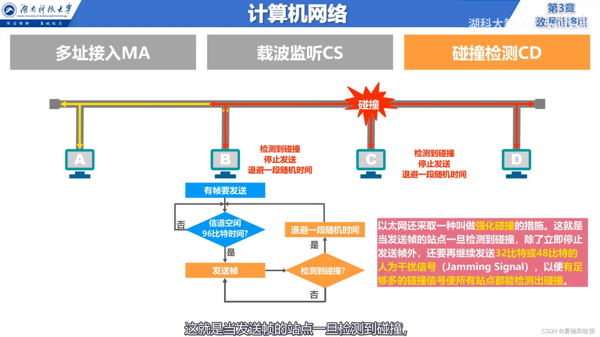 - 功能:如果检测到通信路径上没有其他计算机在通信,即可发送数据。如果检测到冲突,则停止并等待随机时间后重新尝试。