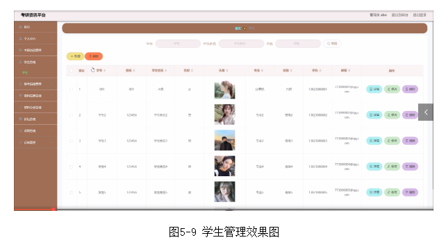 管理员进入后台对学生管理信息进行查看、修改、删除等操作,学生管理功能效果图如图5-9所示。