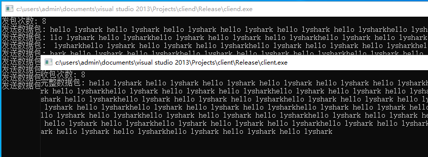运行上述程序片段,读者可看到如下图所示的输出效果,此处只需要分割8个数据包即可完成数据的发送;