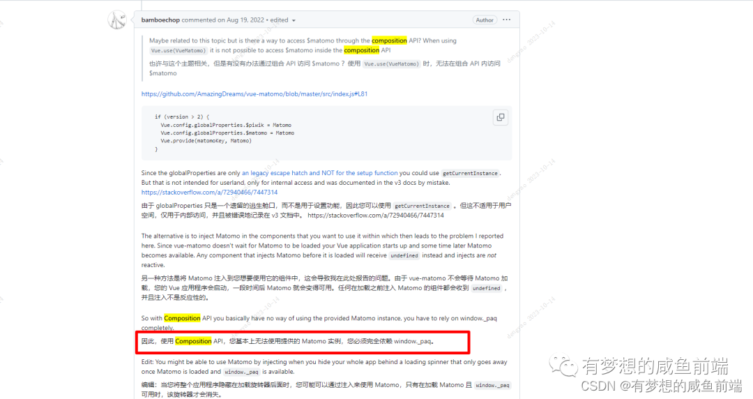 vue3由于使用Composition API,且生命周期机制跟vue2不同,同时matomo又是异步加载资源,所以在main.ts文件中即使挂载了对应的实例,通过getCurrentInstance()?.appContext.config.globalProperties.$matomo 来访问matomo对应实例,无法保证能准确的获取,即使你通过nextTick;因为加载matomo资源不是响应式的,若在页面渲染完成时,matomo资源文件未加载完成,此时获取到的matomo实例仍然为undefined;至于matomo的实例只在页面渲染的那一刻就决定你单次加载是否包含matomo实例