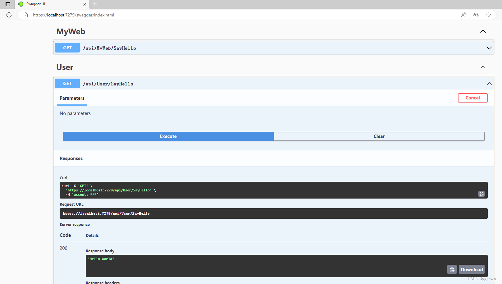 在UserController中增加一个Hello的get方式的接口方法,返回"你好世界",通过请求api/user/hello来获取该接口的结果