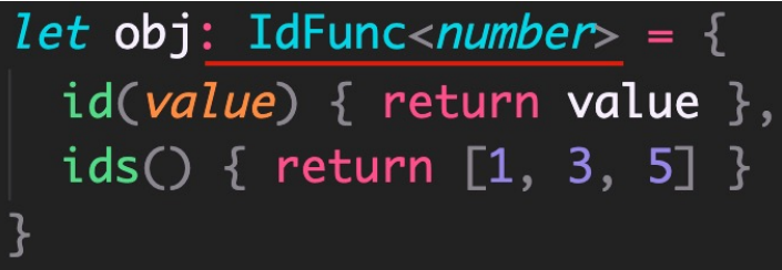 解释:1. 在接口名称的后面添加 <类型变量> ,那么,这个接口就变成了泛型接口。2. 接口的类型变量,对接口中所有其他成员可见,也就是 接口中所有成员都可以使用类型变量 。3. 使用泛型接口时, 需要显式指定 具体的 类型 (比如,此处的 IdFunc)。 4. 此时,id 方法的参数和返回值类型都是 number;ids 方法的返回值类型是 number[]。