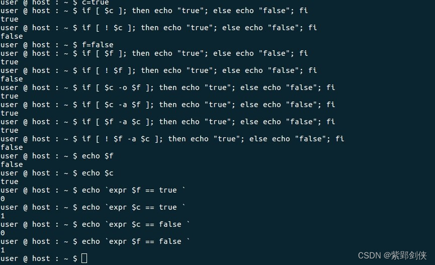 user @ host : ~ $ if [ $c -a $f ]; then echo "true"; else echo "false"; fi