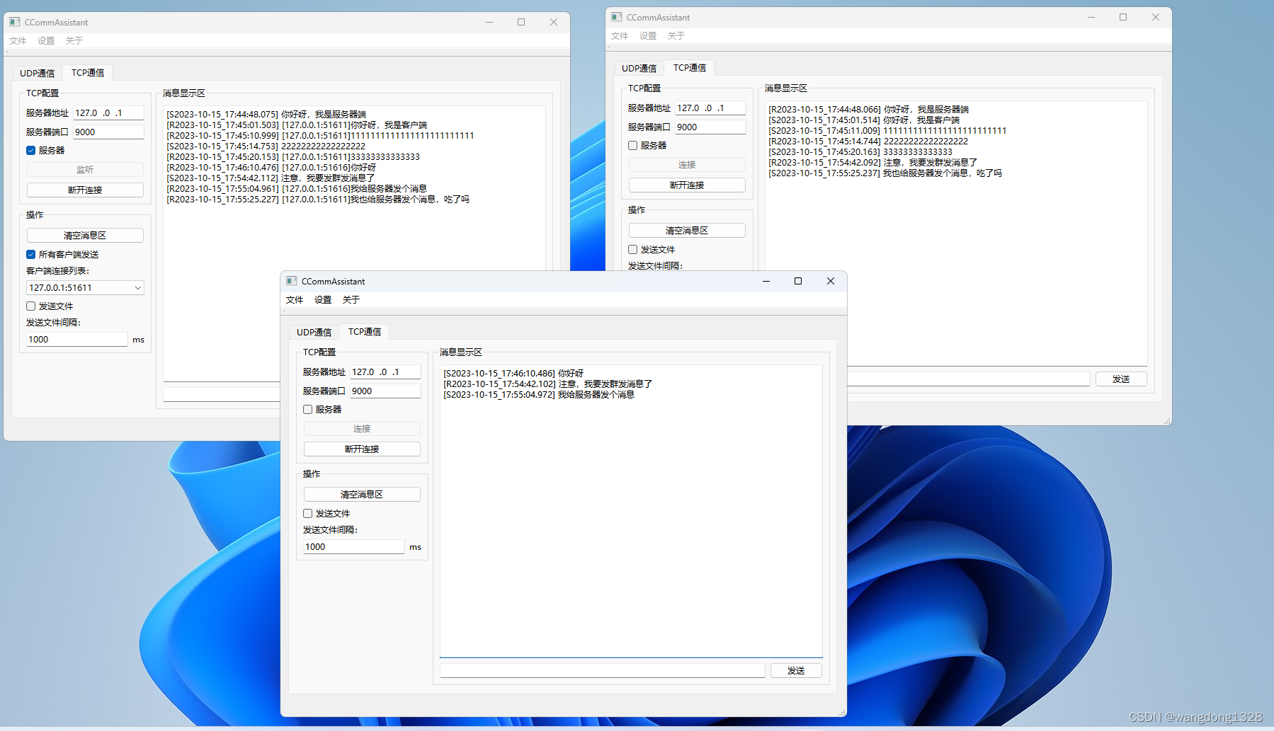 注:勾选服务器后,出现客户端连接列表,可以群发消息和私发消息。