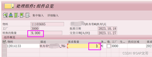 可以看到 组件数量1,转换数量9,也就是1个组件可以制成9个成品,接下来委外发料1个,