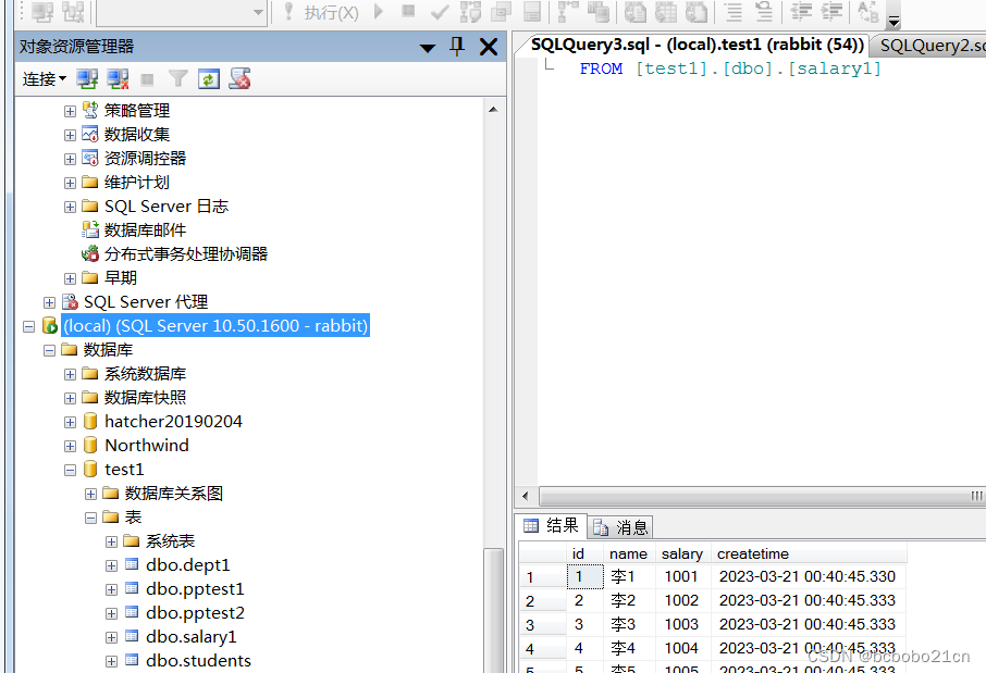 现在rabbit具有了服务器角色,用rabbit登录看一下,可以连接并查询数据了;
