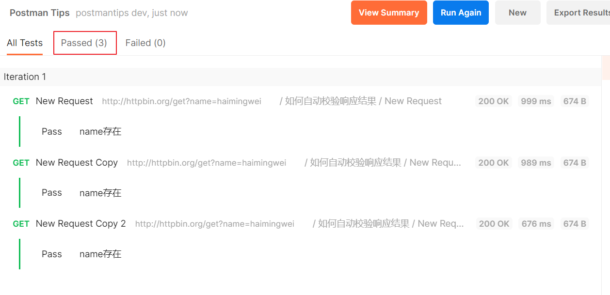 运行完成后, 能直观的查看到哪些用例通过,哪些用例没有通过。