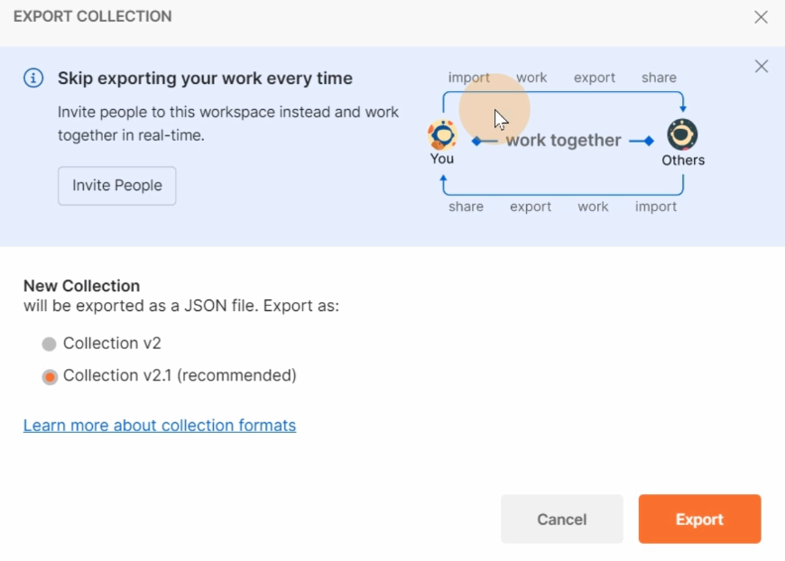 1、导出 postman 中的数据, 导出的 postman 数据存储为 json 格式文件。 这些文件既可以重新导入到 postman 工具中来,也可以导入到其他的测试软件,比如 yapi 等用例管理平台。