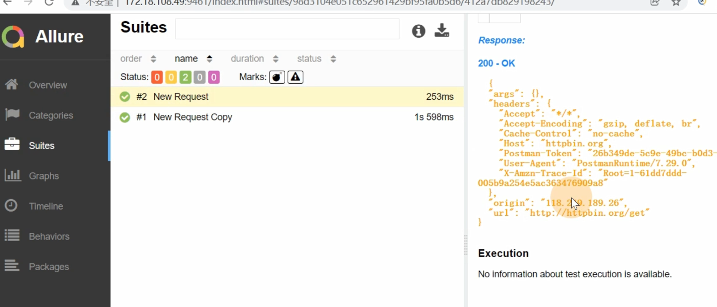 2、通过参数运行用例,运行后自动生成 allure 报告,测试报告会默认在本地的 newman 目录中保存。