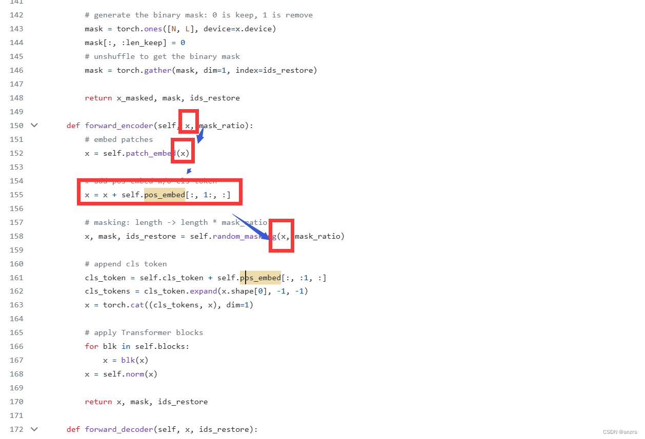 forward encoder的过程,输入是x也就是图像,mask 比例就是mask的比例。