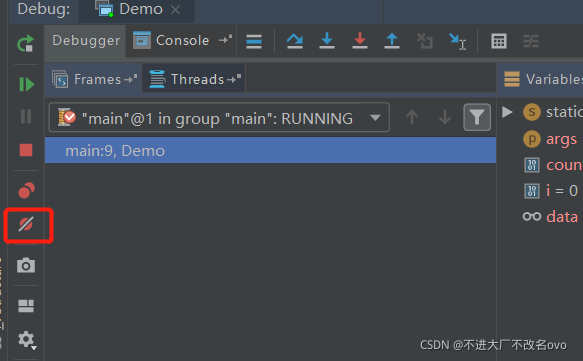 - 添加一句count++,并点击左边红色框中的按钮,执行到下一次断点,即循环了一次