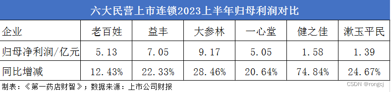 在六大连锁药店之中,老百姓的营收和利润增速都落后于同行,虽然营收规模仍然维持在第一梯队,但营收增速已经是倒数第二,利润增速更是垫底。