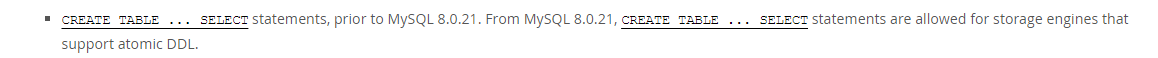 好消息是从 MySQL8.0.21 开始,支持原子 DDL 的存储引擎允许使用 CREATE TABLE ... SELECT ... 语句了。