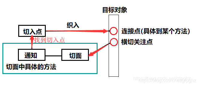 横切关注点,即哪些方法需要被拦截,执行什么样的逻辑。对关注点的抽象,即是切面。一个切面就是一个类,类里面的方法就是一个通知。有了切面和通知,就需要定义这些通知的切入点,换句话说,就是哪些方法需要被拦截,而这些被拦截的方法就是连接点,所谓的连接点就是被织入切面的方法。通知的执行就是织入的过程,而被织入这些通知的对象,就是目标对象。
