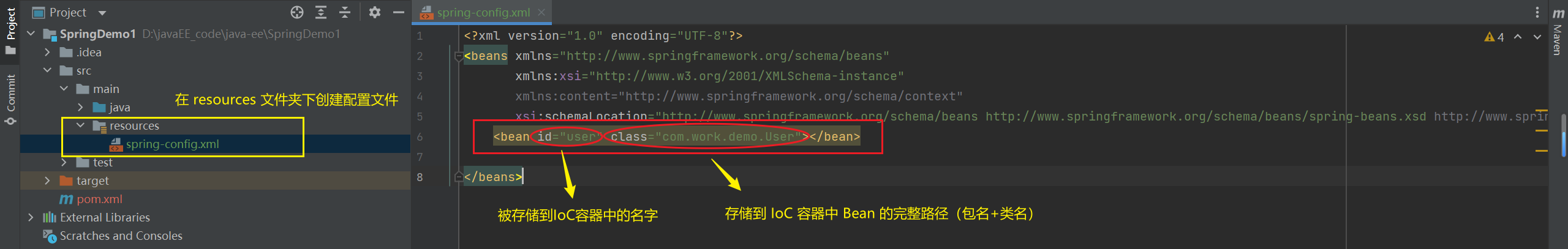 <bean id="user" class="com.work.demo.User">bean>