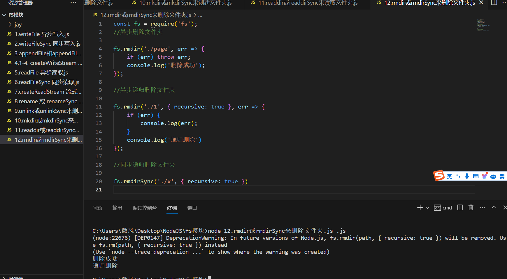 在 Node.js 中,我们可以使用rmdir或rmdirSync来删除文件夹 语法: