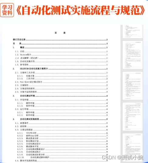 归根到底,还是缺乏自动化实施的经验,而且又没有可参考的自动化测试流程规范。为了提升广大测试小伙伴的自动化项目实施经验,我们给大家总结了一篇《自动化测试实施流程和规范》文档。该文档中详细总结了从早期自动化框架选型,到后期自动化具体运行实施以及框架整合的各种细节