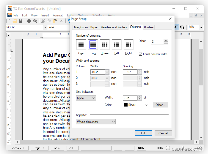 一个文档中可以插入任意数量的列。可以为每个部分或整个文档启用页面列。列的所有方面都可以使用附带的对话框进行设置。