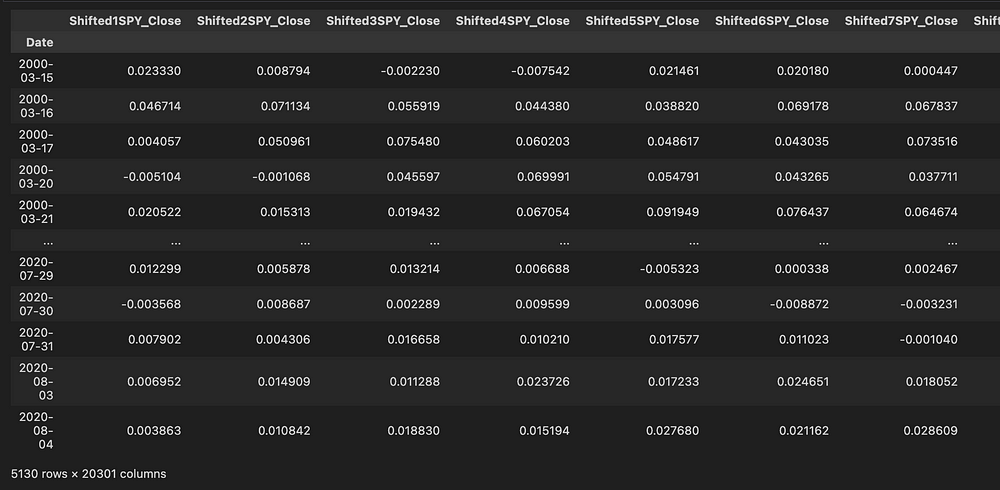 现在输入到我的 Catboost 模型中的数据如下所示,其中每列都展开以包含过去 x 天的百分比变化。现在有20,301 个独特特征被输入到模型中,代表了广泛的历史市场指标。