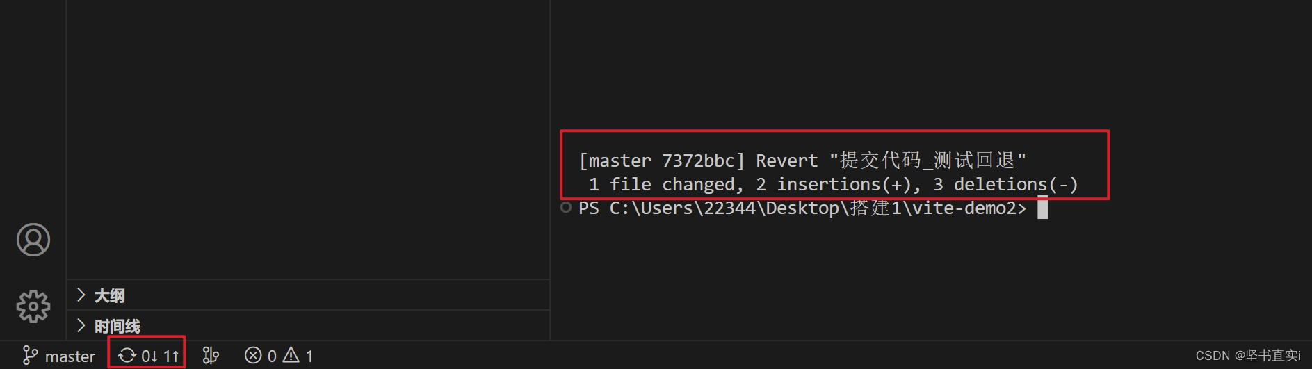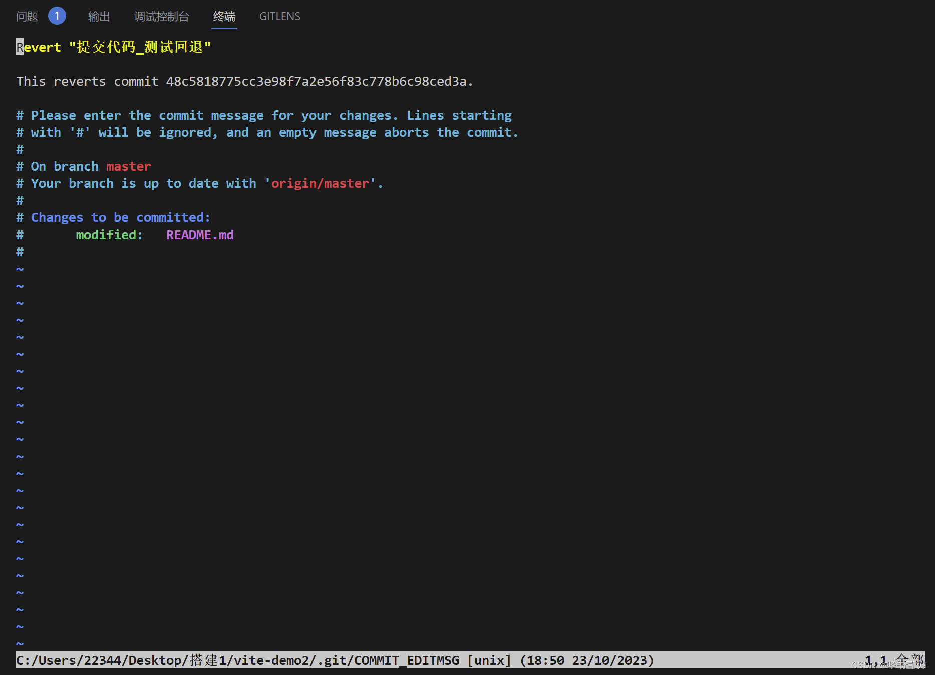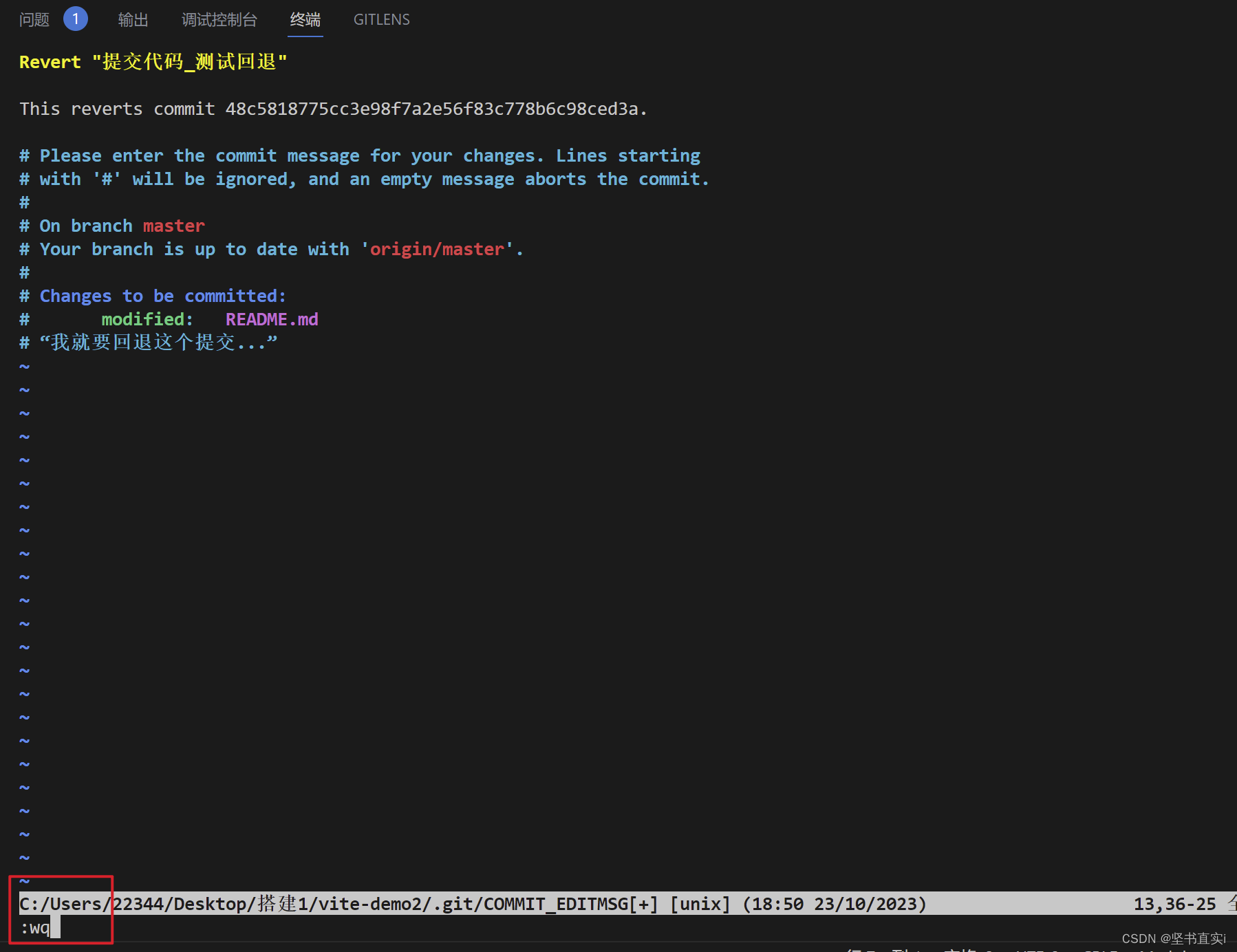 ⑤回车之后,就可以看到已经回退成功了,这时代码回退状态属于commit 的状态;