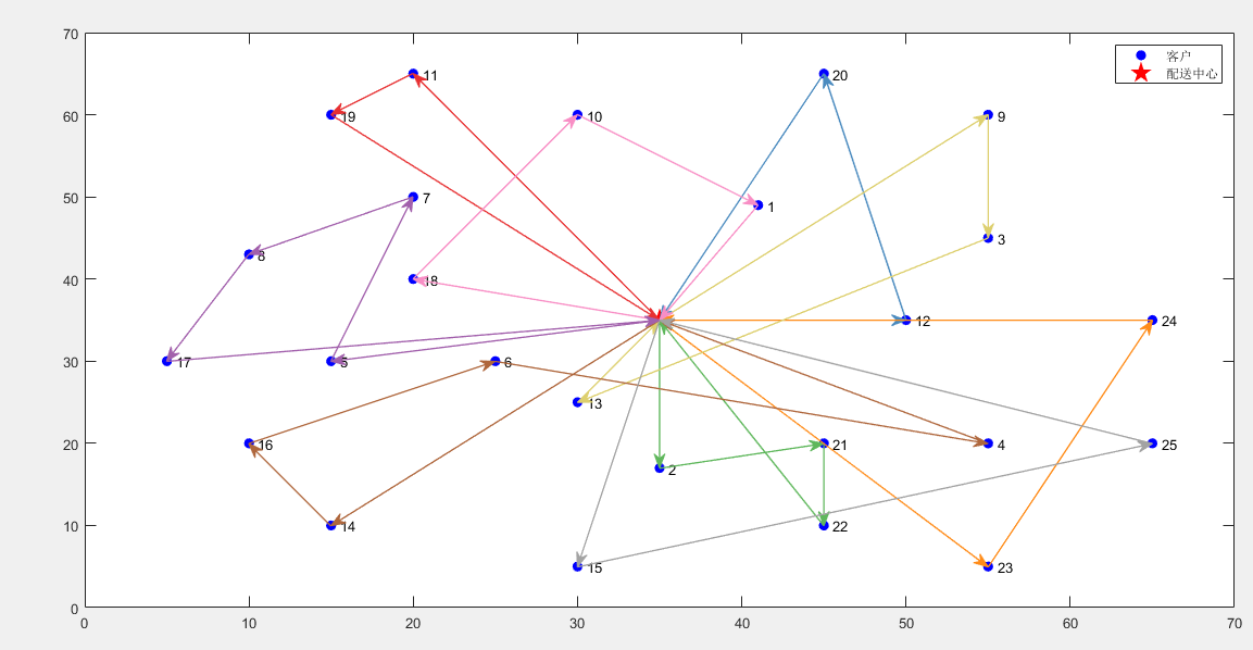 配送路线7:0->18->10->1->0 服务顾客数量:3 路径长度:68.95996 装载量:38