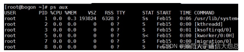 USER:该 process 属于哪个使用者账号 ==PID :该 process 的ID== ==%CPU:该 process 使用掉的 CPU 资源百分比== ==%MEM:该 process 所占用的物理内存百分比== VSZ :该 process 使用掉的虚拟内存量 (Kbytes) RSS :该 process 占用的固定的内存量 (Kbytes) TTY :该 process 是在那个终端机上面运作,若与终端机无关,则显示 ?,另外, tty1-tty6 是本机上面的登入者程序,若为 pts/0 等等的,则表示为由网络连接进主机的程序。 ==STAT:该程序目前的状态,主要的状态有== R :该程序目前正在运作,或者是可被运作 S :该程序目前正在睡眠当中 (可说是 idle 状态),但可被某些讯号 (signal) 唤醒。 T :该程序目前正在侦测或者是停止了 ==Z :该程序应该已经终止,但是其父程序却无法正常的终止他,造成 zombie (疆尸) 程序的状态== START:该 process 被触发启动的时间 TIME :该 process 实际使用 CPU 运作的时间 COMMAND:该程序的实际指令