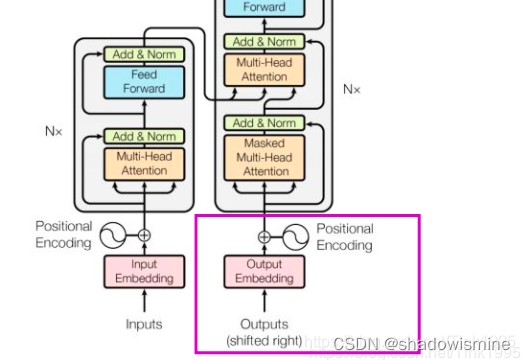 Transformer 的 Decoder的输入与Encoder的输出处理方法步骤是一样地,一个接受source数据,一个接受target数据,对应到上面例子里面就是:Encoder接受英文"Tom chase Jerry",Decoder接受中文"汤姆追逐杰瑞"。只是在有target数据时也就是在进行有监督训练时才会接受Outputs Embedding,进行预测时则不会接收。