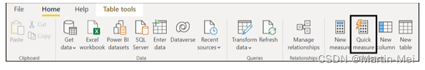 要实现度量,最简单的方法是单击功能区“计算”区域中的“快速度量”图标。(当您处于“数据”视图中时,该区域位于Ribbon的“主页”选项卡上,如图8-5所示。)