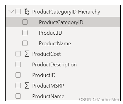 Power BI中的一种常见做法是使层次结构变平——换句话说,使层次结构成为一个级别——这样,一个规则的层次结构就由层次结构的一列组成。每个节点都表示在一个单独的、不同的列中。在图8-8中,您可以看到产品类别ID是如何与产品名称和产品ID绑定的。这表示一个两级层次结构,因为每个项目都与一个公共因素(产品类别ID)互斥。