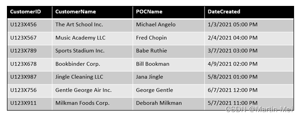 注意图8-1中的四列。这些数据列中的每一列都可能有一个唯一的标识符:一个特定的时间/日期戳,显示输入客户数据的时间、公司名称、客户ID和公司联系人。这些数据点中的每一个都可以用作查找,以更好地独立评估详细的客户信息。然而,当你看模型时,它可以独立存在。当报告需求是线性和简单的,只需要一个表时,您可以考虑使用平面模式。
