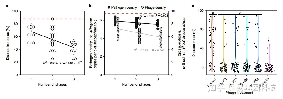 图a,b 是温室试验,图c是大田试验的结果。(红色虚线表示在没有噬菌体的对照处理中观察到的值)